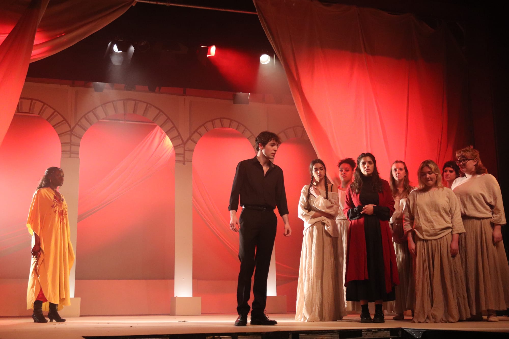 The casting call for this production specifically stipulated a woman of colour to play Medea and the importance of this choice to the directors' greater vision is clear from the jump. Her monologue when she describes how she is othered by the Greek court and discriminatorily seen as fundamentally unstable and dangerous lands entirely different when delivered by a black performer. Sabally's performance (her DramSoc debut) has gotten most of the buzz coming out of this show and she is entirely deserving of it. The script requires the actress playing Medea to be able to lay on false, insincere contrition for the benefit of her larger plan in a way that still makes it clear to the audience, but never her scene partner, that these are nothing more than crocodile tears. A daunting tightrope walk for any actor and yet Sabally walks it with the skill and virtuosity of a professional acrobat.