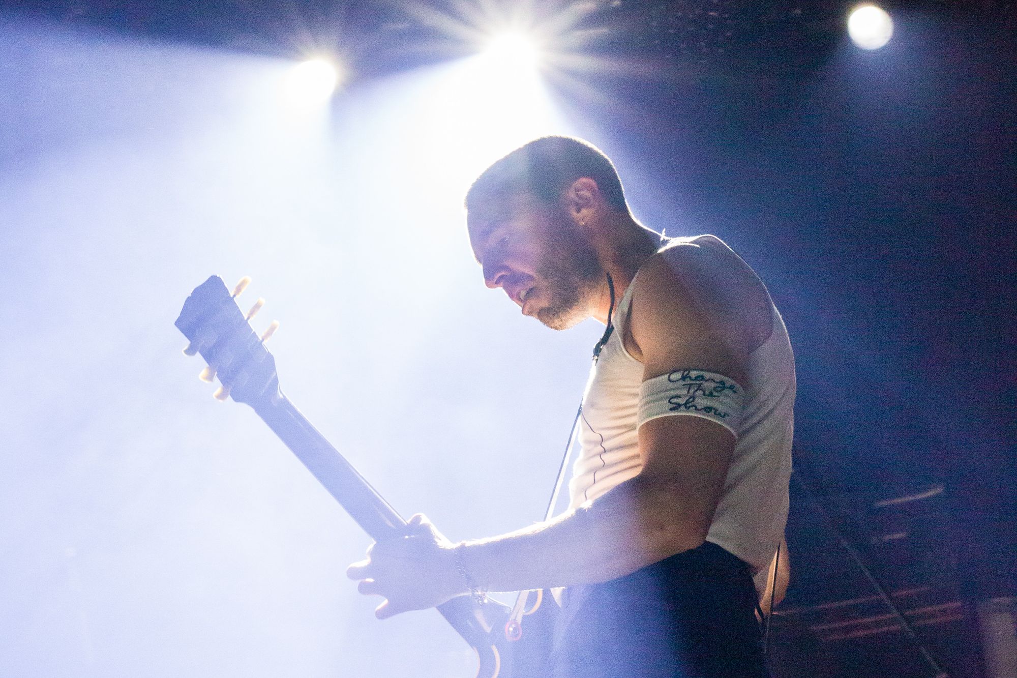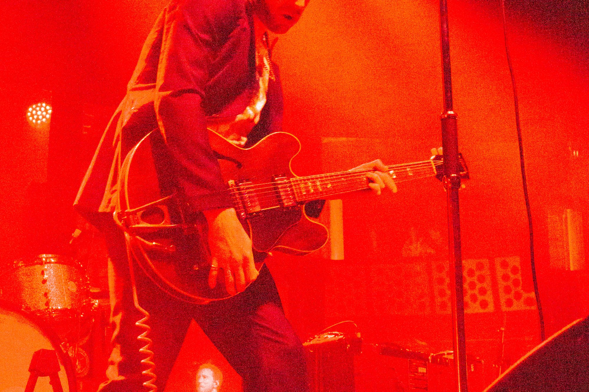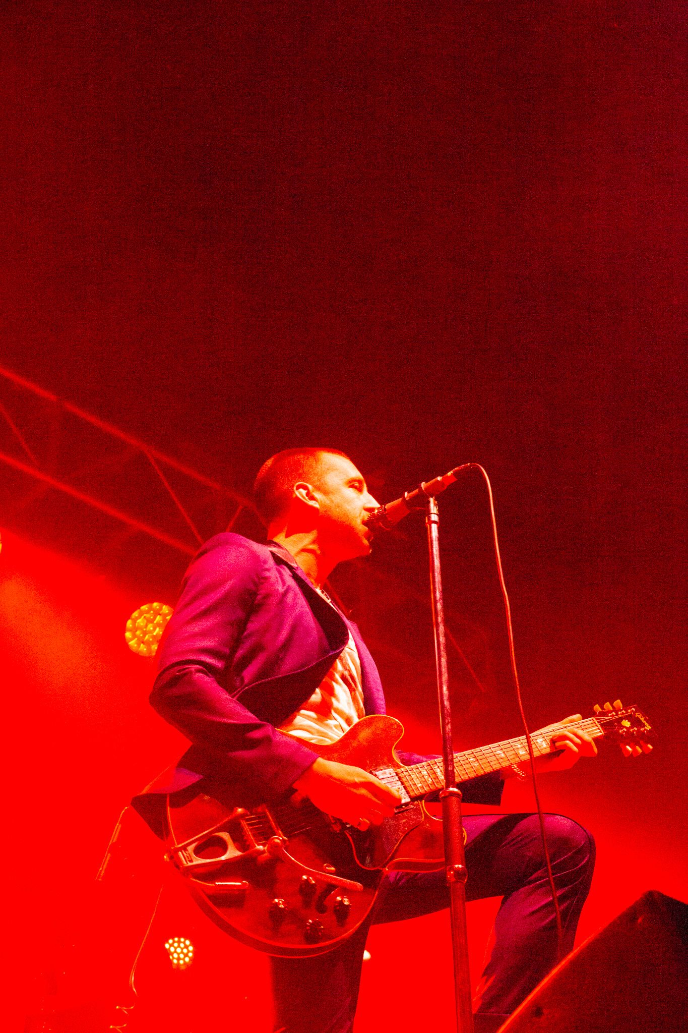 Miles Kane is a person of details. His stage set up only confirms this with tiny, elevated areas for his fellow band members and a backdrop of mirrors. The band comes on in a single file line, determined and strong footed. They start with a classic — ‘Don’t Let It Get You Down’. Of course. Kane is a very classy man. He comes on wearing a navy blue suit with a pair of brown leather shoes that match his guitar. Beneath he fashions a white tank top, merch from opening act Brooke Combe, and arm band just beneath his left shoulder. It’s giving proud-cool-indie Uncle that visits rarely because he’s too busy with his band and abstract woodworking projects.
