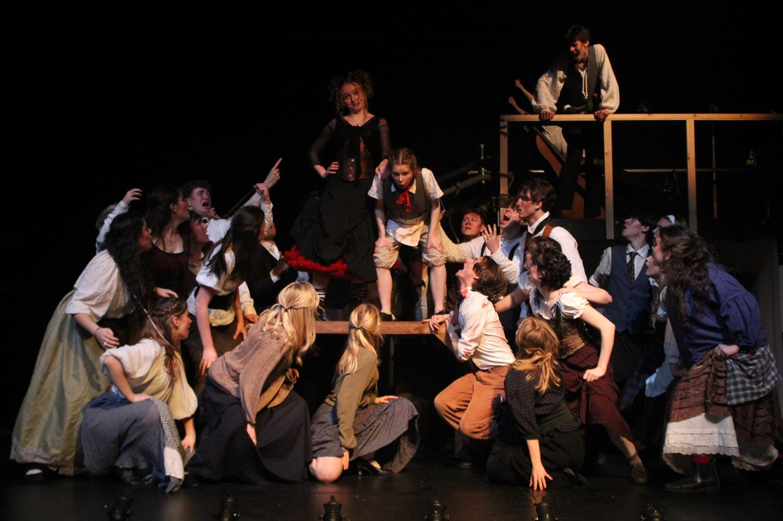 The stage itself, curated by Aesthetic Designer Eli Grundy, was stripped back to student theatre’s black box roots. The Winston’s stage becomes the great black pit of London, evoking the dark god Sweeney it is said to serve, increasing the sense of death and misery Sondheim’s musical revels in. The set pieces themselves were likewise sparse. The pie oven upstage, a few draws and a table for the pie shop itself were overshadowed by the stairs leading to the second floor. Here on the set’s second tier, Sweeney’s bare barbershop housed his fancy chair. Looming over proceedings the barber chair featured a trap door and slide mechanism that ejected Sweeney’s victims down to Mrs Lovett’s pie shop below, keeping this show in line with all other major productions of Sweeney Todd. Impressive as this mechanism was, its need to be raised to a sufficient height led it to claim victims of its own. Namely, the spines of the audience members in the back rows who had to stoop down in order to see the faces of the actors stood on the platform.