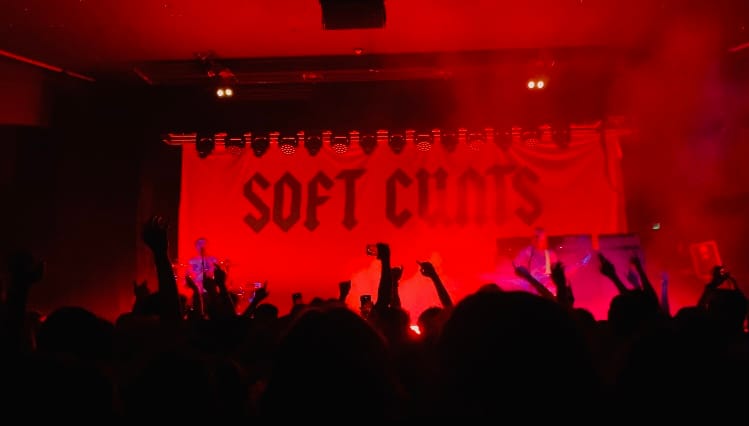 Displayed across the back wall, in what is in no doubt viewed as a contentious act by the older gig goers - Soft C*nts. If nothing else, this act alone, echoing the lyrics of their recent single 'Punks Dead' establishes Soft play as Punk at their core.