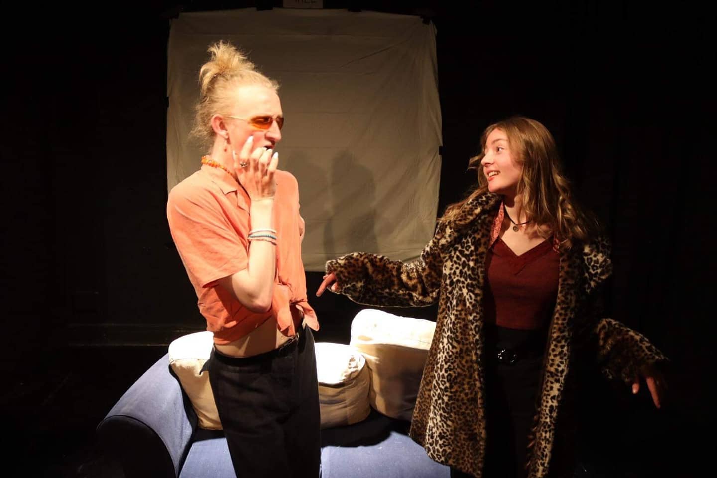 Ethan’s lover’s wake is set in their living room, with the first scene opening with a farcical interaction between Ethan and Penelope. Penelope is a middle to upper class UoB student parading the stage in a furry leopard print and flares. She exclaims that she cannot eat the buffet because she is gluten and meat free, but likes to separate her dietary habits with her favourite sport - hunting.