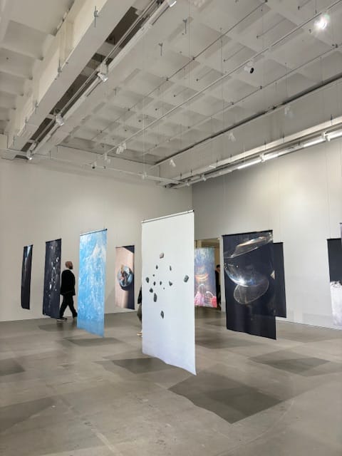 She asks visitors to look for the similarities between the serene natural world and our time peaceful spent in our homes, following rhythms of flowing rivers, swaying trees alongside gentle domestic scenes, to comment on ‘humanity’s fragile links to the universe and ecology.’