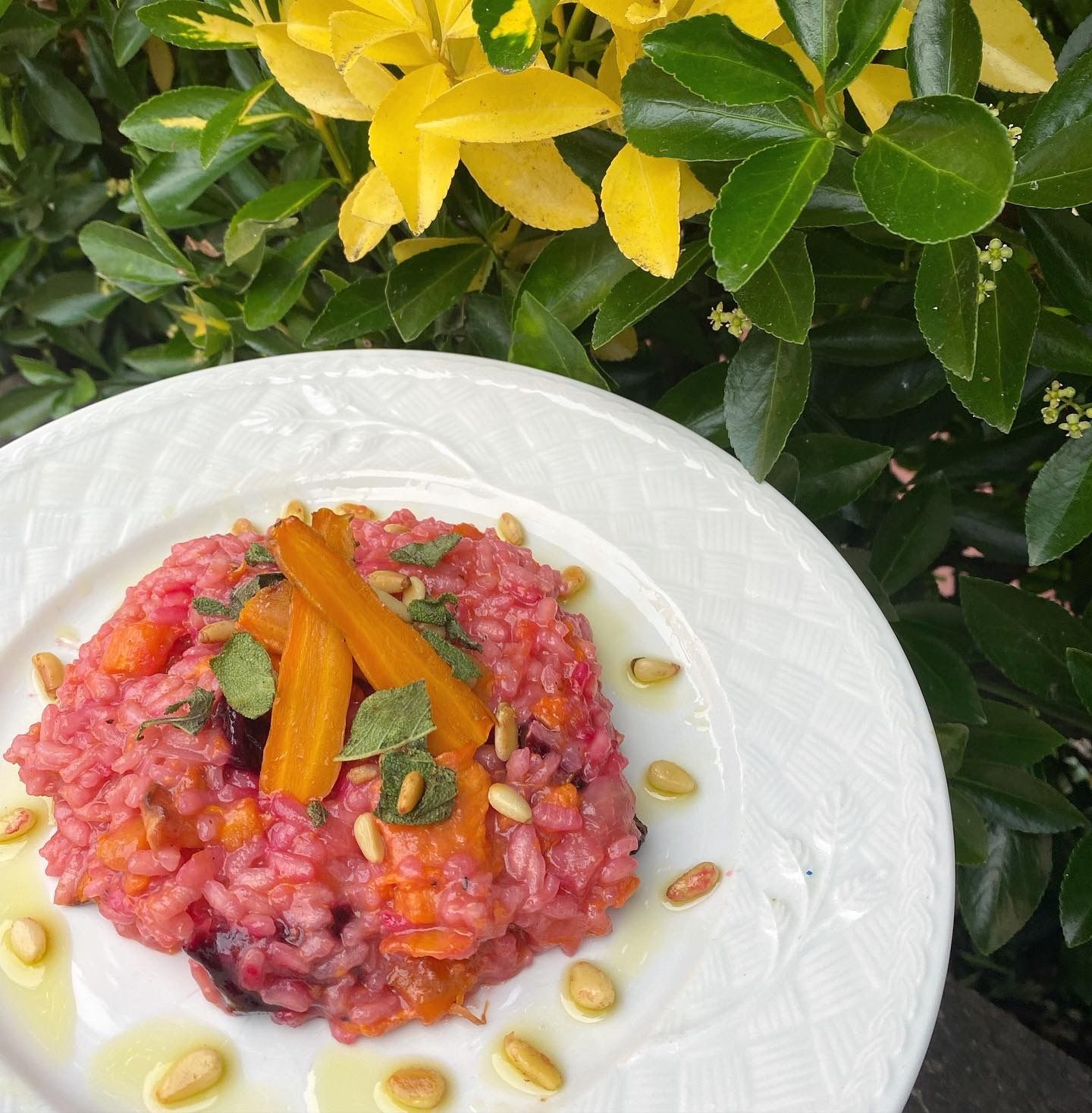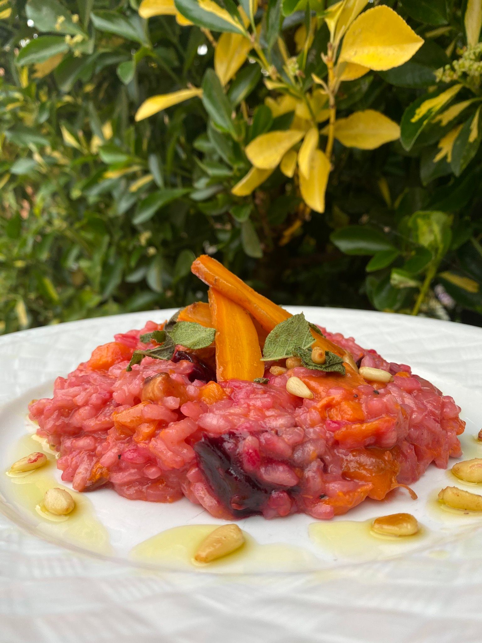 12. Plate up with the remaining roasted veg, drizzle in truffle oil along with the sage and pine nuts
