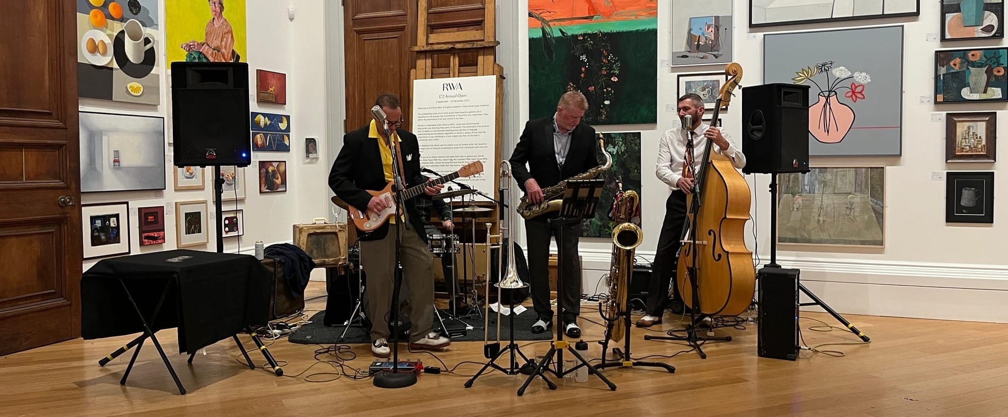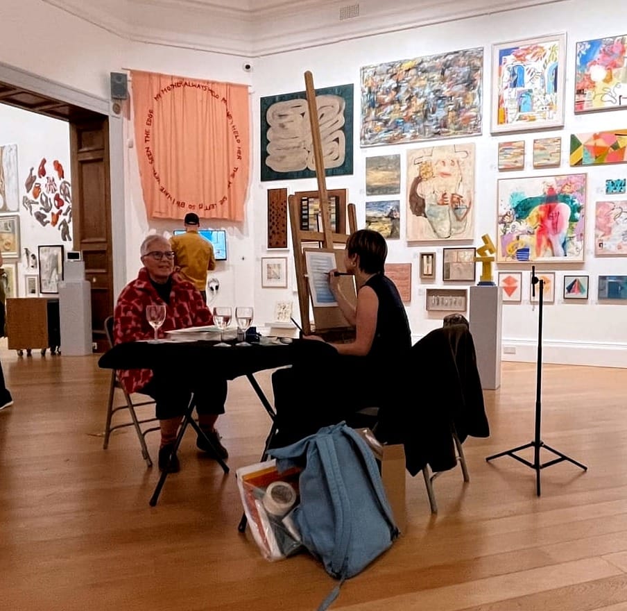 The gallery was humming with an air of anticipation as guests picked out their favourite pieces, guessed the artist behind the work and placed final bids. In the main gallery, celebration was in full swing complete with a jazz band, a quick-drawing portrait artist, Alice Dunn Ribiero, and live tours of the Annual Open Exhibition.