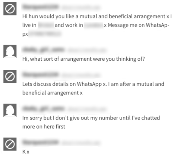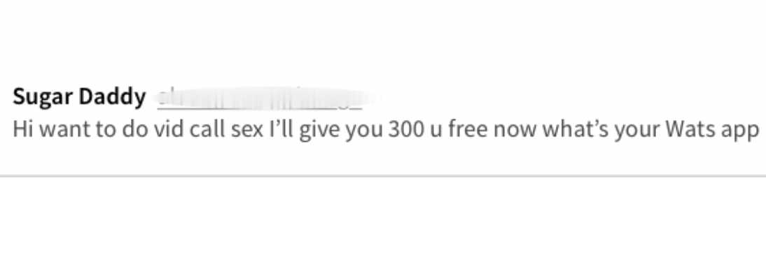 One message received by both reporters said ‘Hi, want to do vid call sex I’ll give you 300 u free now what’s your wats app’. Another Sugar Daddy asked one reporter if she minded not using condoms. ​However, many were more careful not to be explicit about what they were looking for, instead using language such as ‘overnight stays’, ‘intimate meets’ or ‘adult needs’ to soften the reality of what they were expecting.