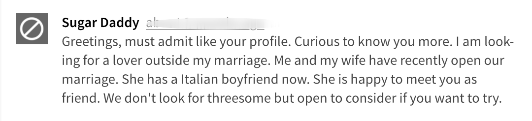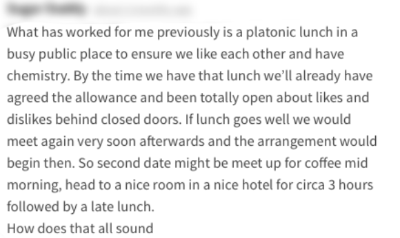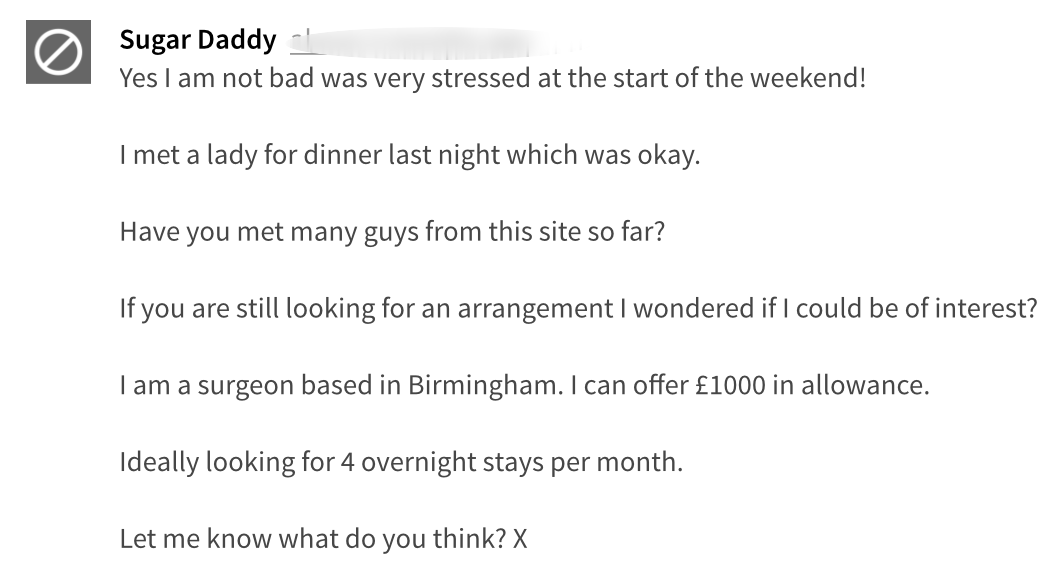 One Sugar Daddy opened communications with, ‘Women often complain that men only want one thing. On this site that’s probably true, people just express it differently. Are you up for that sort of arrangement?’​