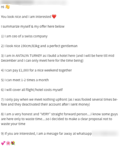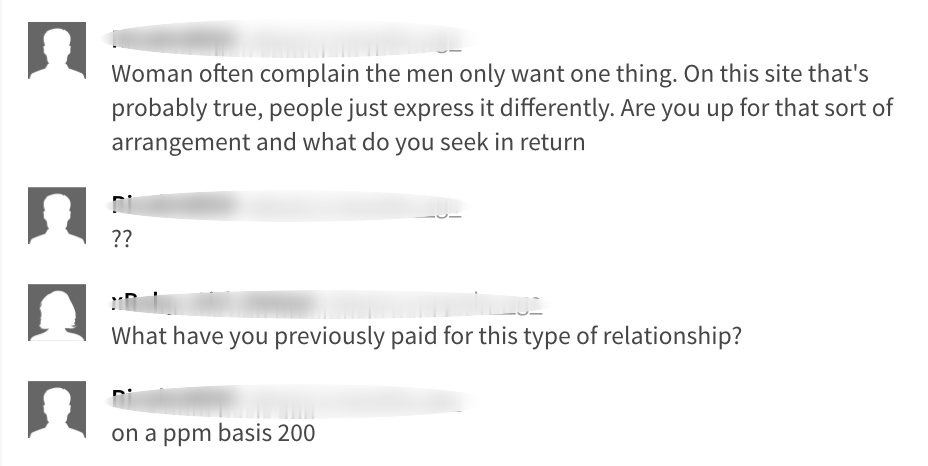 Despite SeekingArrangement stating that their members are looking for ‘hypergamous relationships’, many men were looking for transactional relationships, mostly in the form of 'pay-per-meets.'