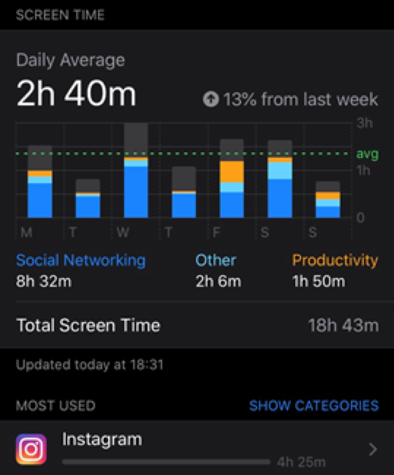 Staring in disbelief at the statistics, one thing became blatantly obvious: I am an Instagram fiend. I love Instagram... but I also hate it. In just one week I had opened-up Instagram 135 times and devoted 4 hours and 37 minutes of my precious time to the app.