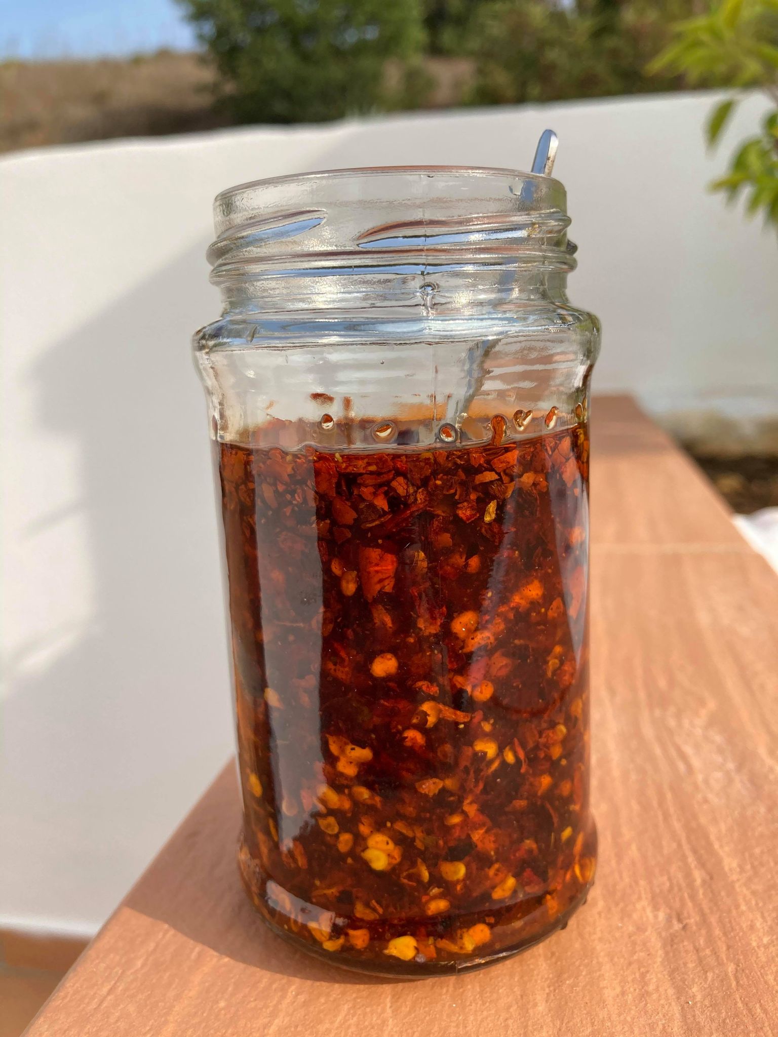 Let it sizzle and then cool for longer than you think (hours) – the oil will be much hotter than it looks. (N.B. if you are planning on using very hot dried chilli flakes then maybe keep a window open.)
