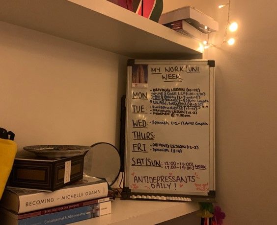 Whiteboards are pretty room décor and helpful for planning too. The image above is just one example of my week as a law student, with a part-time job and other commitments. Due to my neurodiversity, I meticulously plan my weeks to maximise productivity. I have learnt that this method is a helpful visual reminder. My whiteboard also reminds me of how productive I have been that day or week. I find it very reassuring.