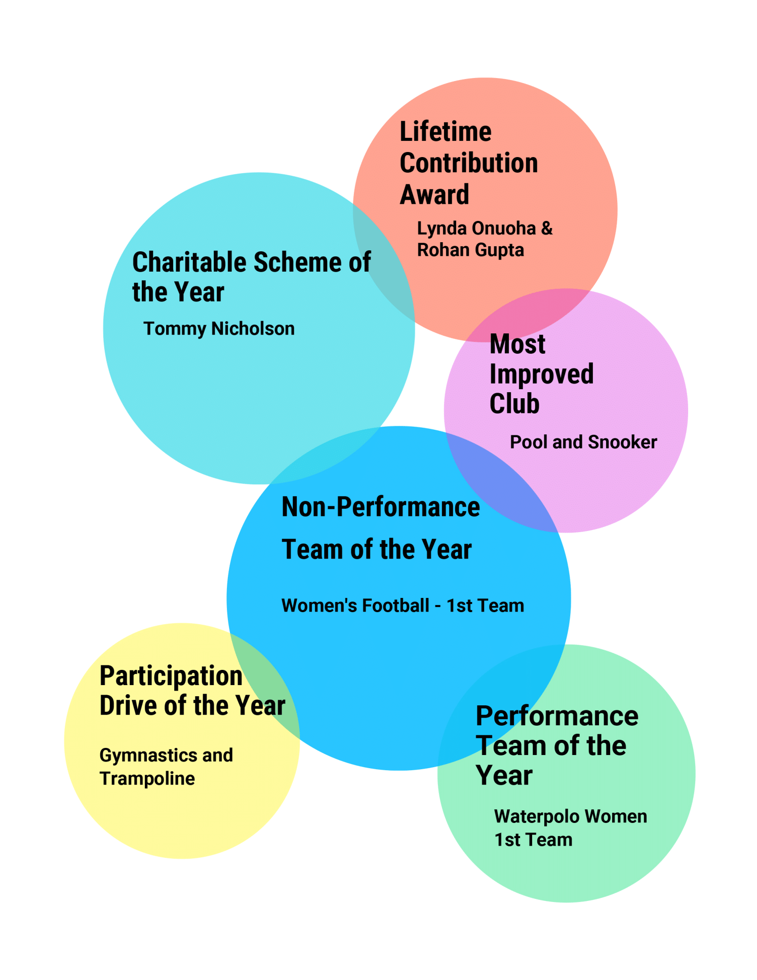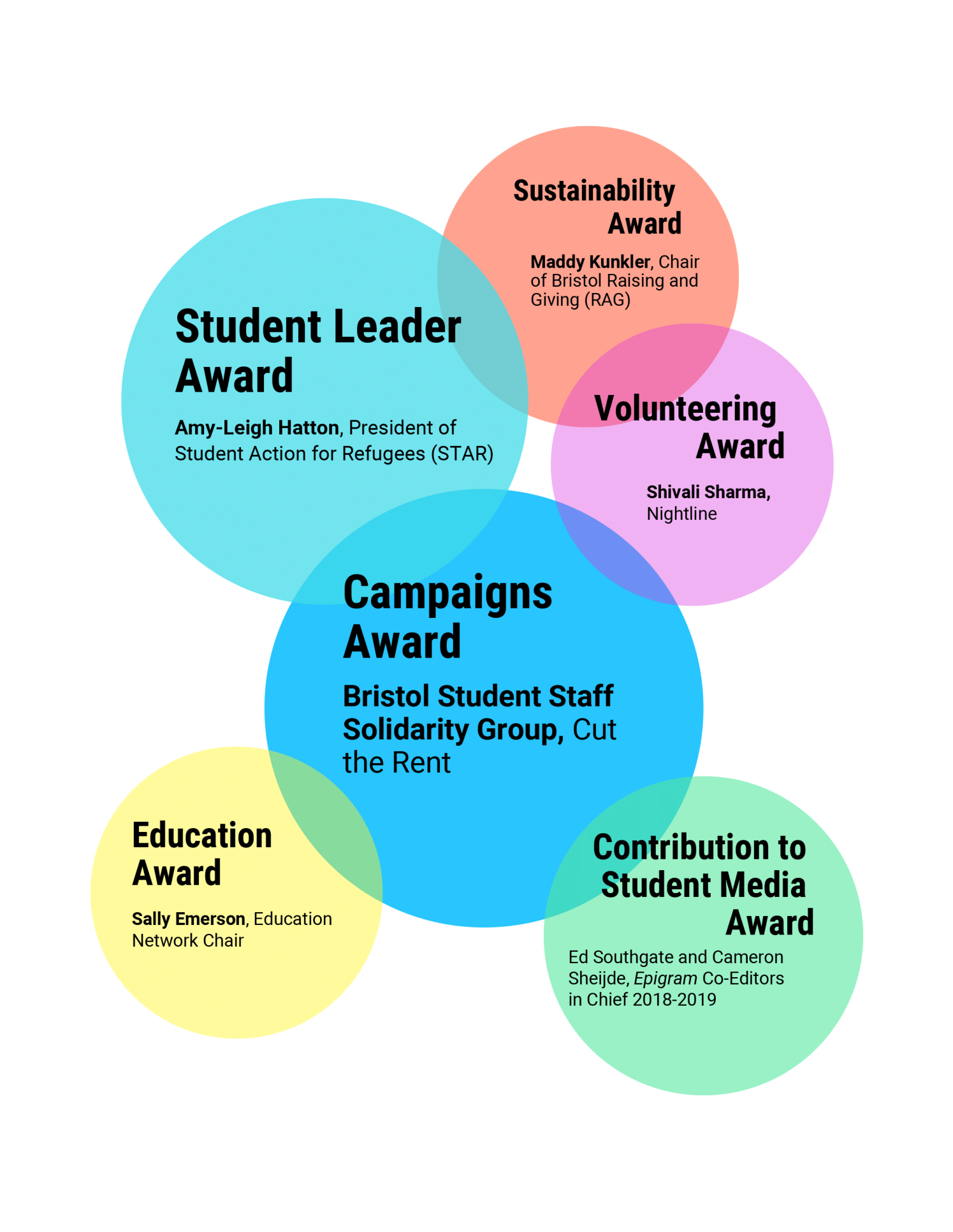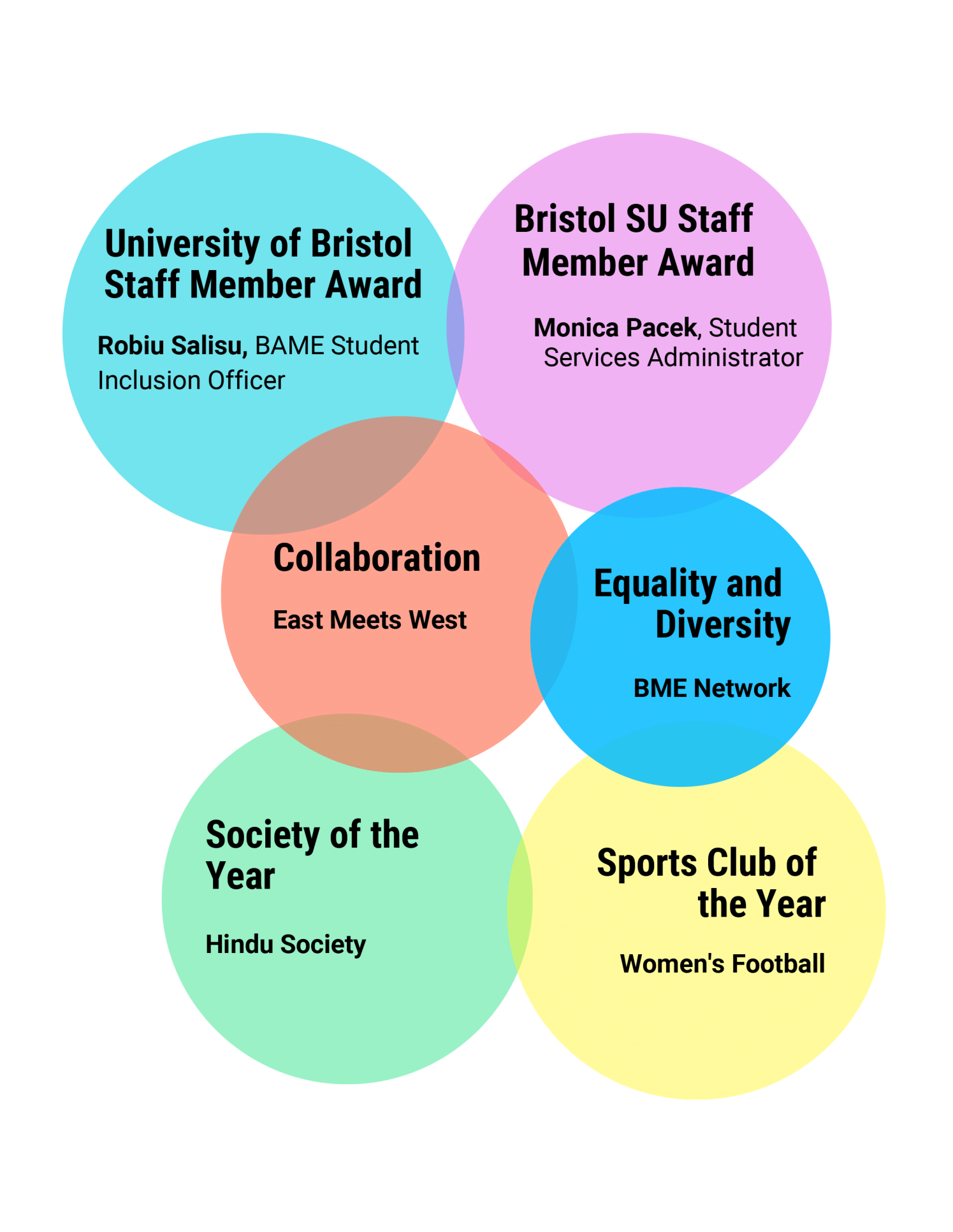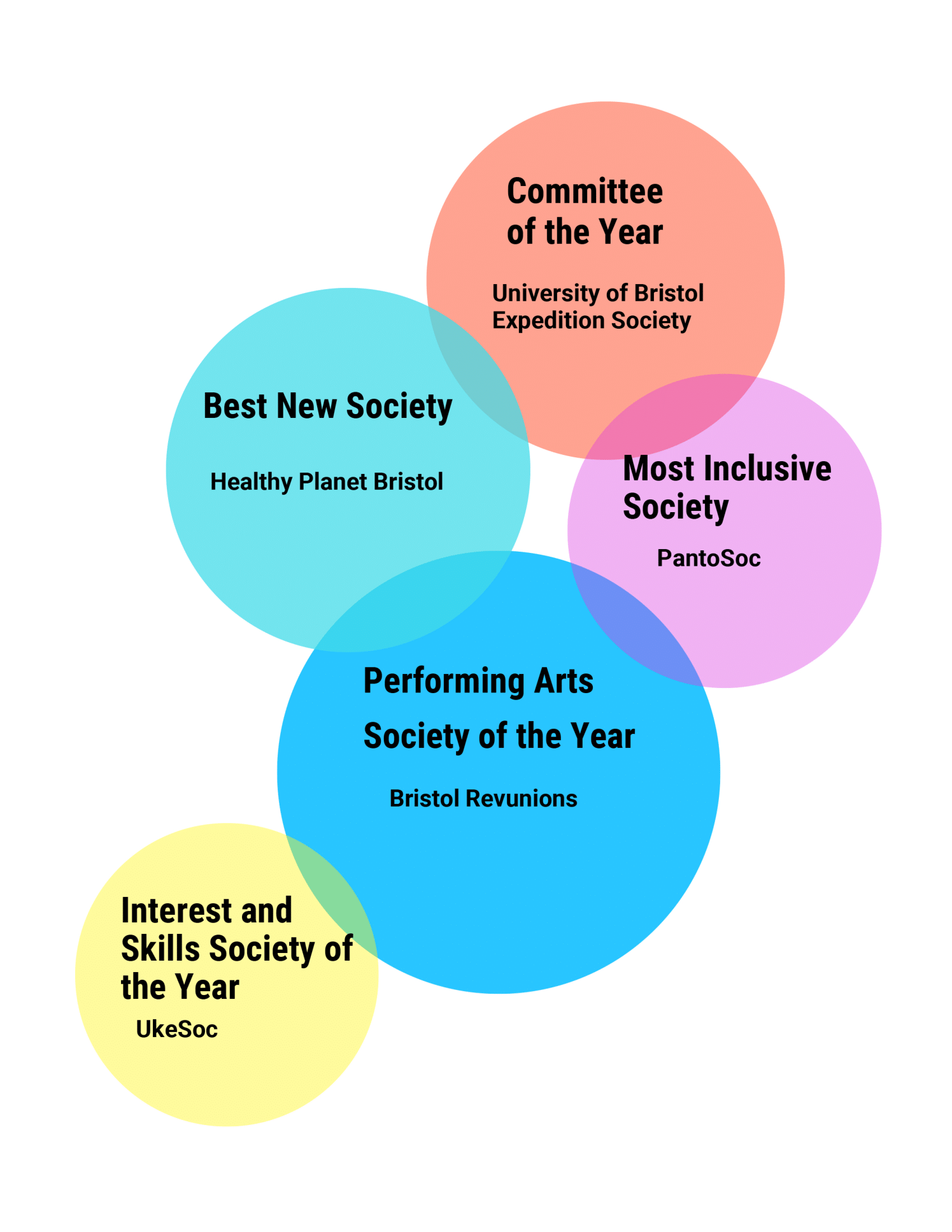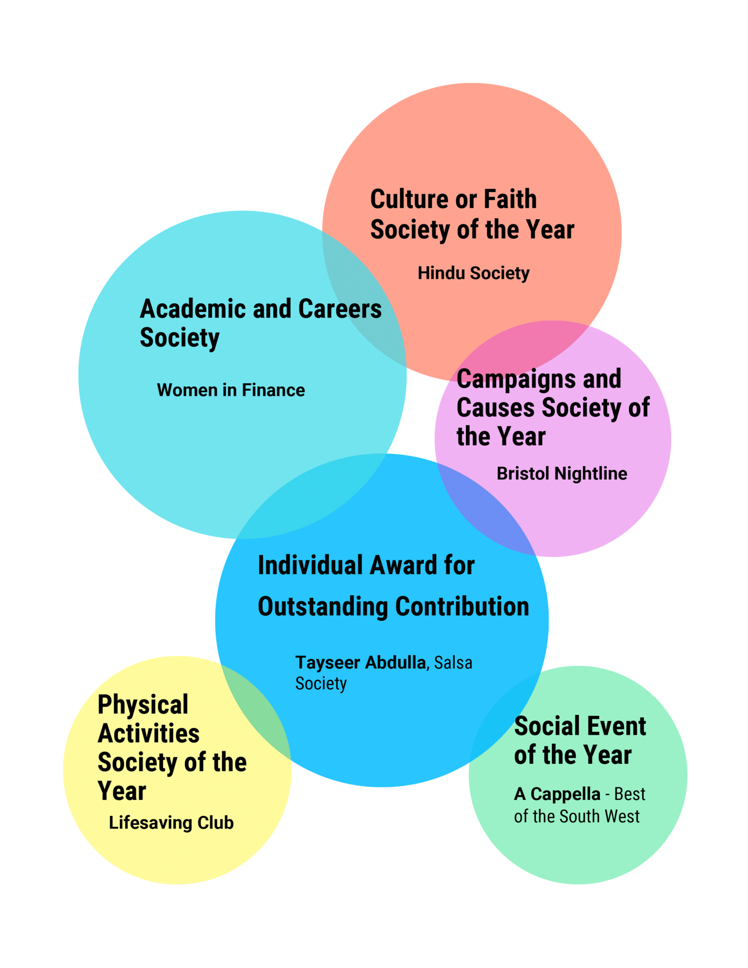 Many other societies and sports clubs were presented awards at the Society and Sports Awards respectively, with 23 student groups or individuals winning prizes. The full list of winners for those events can also be seen below. All nominees can be seen on the Bristol SU website.