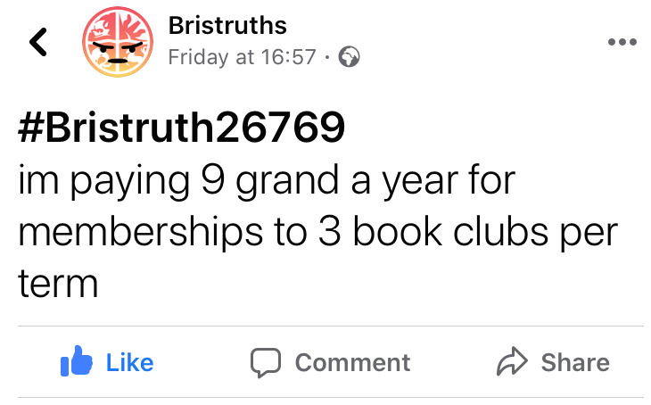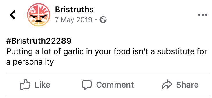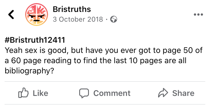 Take these submissions for example. Short, snappy, witty and relatable - because who doesn’t like garlic right? Your degree is basically an expensive book club? No problem! Vegan sausage roll anyone? I for one tagged my flatmates in these witty posts, contributing to my cheeky (but still unclaimed) top fan badge status. Another fad lies with the ‘.... isn’t a substitute for a personality’, which took off on the Bristruth page, and even took off away from the screen - overhearing banterous comments of ‘having pastel highlighters isn’t a substitute for a personality’ in the ASS cafe was one of my personal favourites.