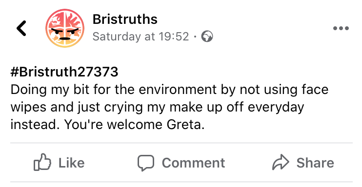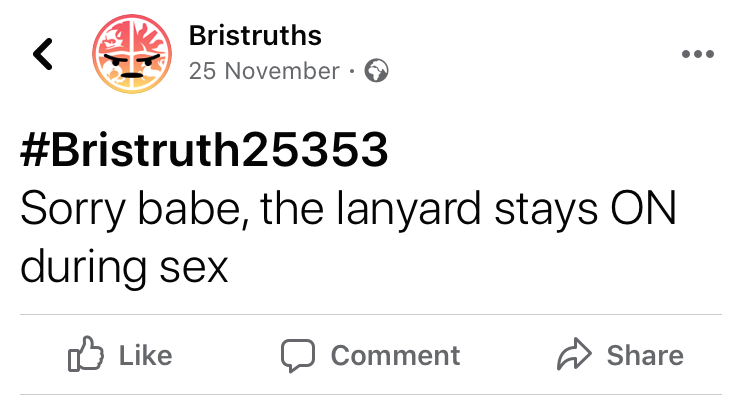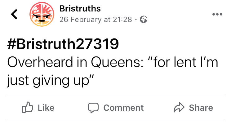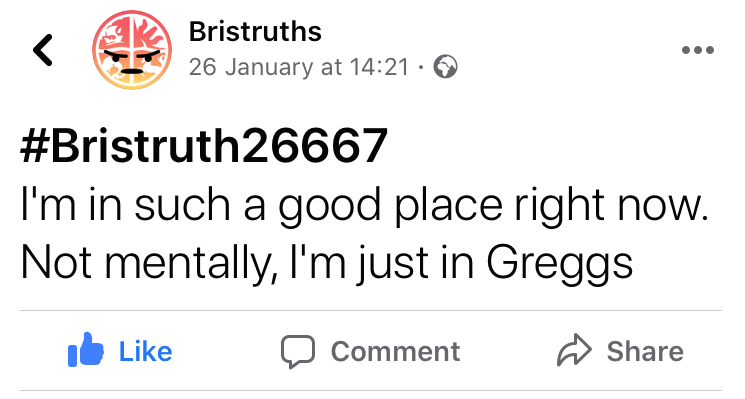 Facebook verified top fan badge holder Leah Martindale writes, 'the ultimate Bristruth success relies on at least two of the golden trifecta of posts: humour, relatability, and snappiness. If your post is funny and relatable, we allow excess length - see: the library reviewer. If your post is snappy and relatable, we excuse questionable humour - see: ‘stays on during sex’ gags. If your post is snappy and funny, it doesn’t need to be particularly relatable - see: the ski trip shenanigans. The ultimate Bristruth, however, merges all three of these qualities for a short sharp laugh you’re sure you could have experienced yourself. It is for this reason alone that the 'overheard in Bristol' Bristruths reign supreme, and will live forever, like reviews, substitute for a personality, or phantom lift shitter fads.’