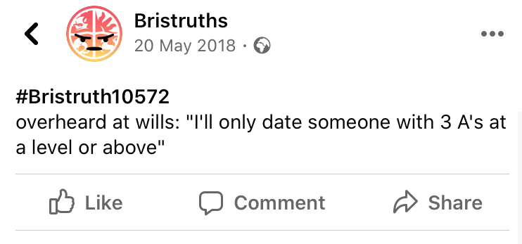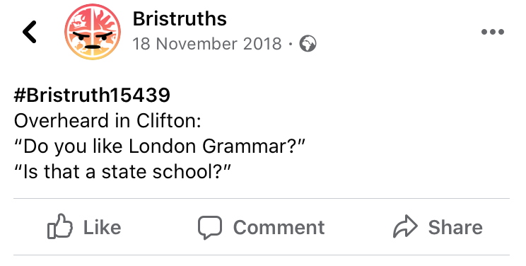 The classic overheard posts. Particularly the laughable Wills comments seem to make a stand out appearance amongst the most successful Bristruths. Whilst quite unrelatable to the average Joe, the pretentious remarks speak for themselves as to their success on the page.
