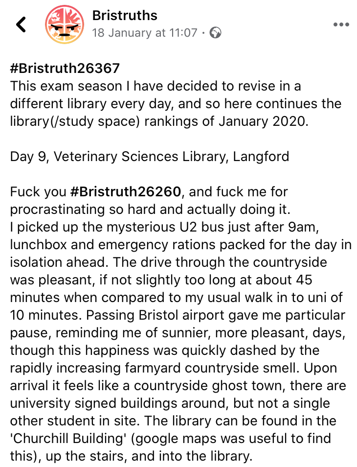 How can we forget the infamous phantom lift shitter of Unite House. Driving away from the need for a short and snappy post, these ones are good long reads. Gaining over 400 likes on its initial posting, the community of Bristruth lapped this one right up. The mystery still remains and the shitter is still on the loose - ready to strike another lift, laundry room or hallway just waiting for that next perfect successful Bristruth. Don't forget the popular Library Reviewer which popped up this January exam season, truly aiding our revision procrastination.