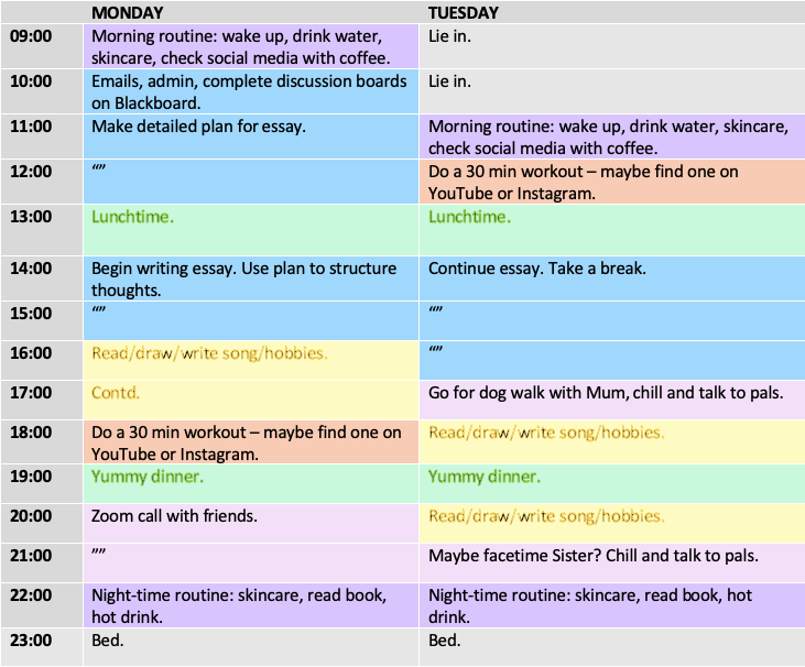 The positive side of losing all structure now that uni has gone online is that you can completely renovate your timetable to suit your own needs. Take a minute to self-assess what you spend your time doing, how much you enjoy each activity, what you tend to over-indulge in and what you tend to avoid.