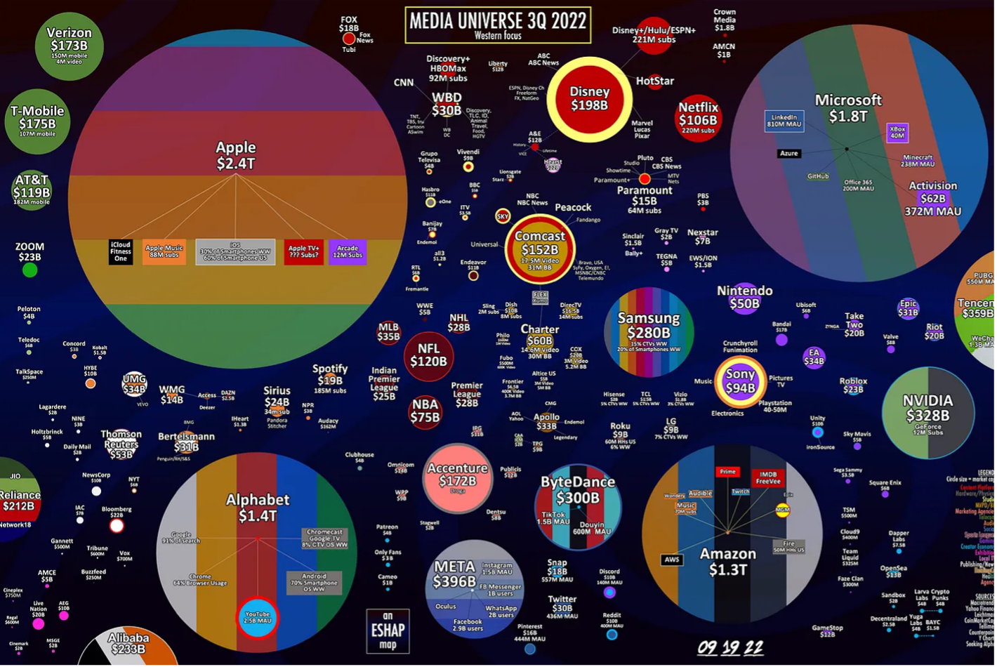 ‘Half the problem,’ notes Sam Barcroft, ‘is that the shape of the media universe has transformed in the last decade alone.’ Sam is the founder of Creatorville, a YouTube production company with a vision to democratise content production. He notes that Meta, formerly Facebook, has shrunk from being valued at $1.4Tn in 2021 to $326Bn in 2022. ByteDance has grown by 417%, and the BBC has maintained its meagre $5Bn share.