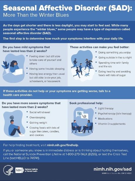 The mental health charity Mind outlines how symptoms have a large impact on the day-to-day lives of those who struggle with SAD and highlight the need to de-stigmatise open discussions regarding the severity of mental health issues. Symptoms and signs vary depending on the individual, but include: lack of energy, finding it hard to concentrate, not wanting to see people, sleep problems and changes to your sleep schedule, feeling sad, low, tearful, guilty or hopeless, changes in your appetite, being more prone to physical health problems, such as colds, infections or other illnesses, losing interest in sex or physical contact, and suicidal feelings. For students, there is an evident correlation between these troubles and academic stress, loss of motivation, and loneliness or anxiety in social situations.