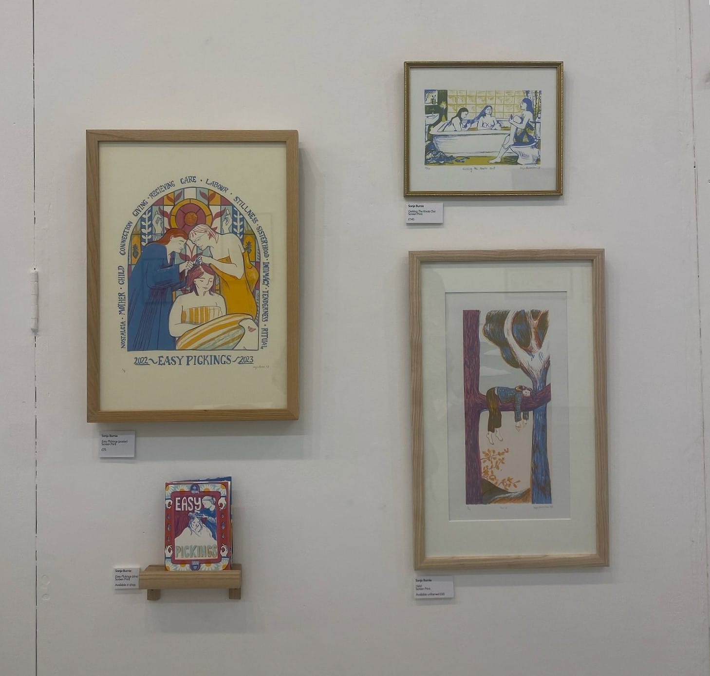 A lot of the work had a playful, almost childlike wonder, whether that’s through the expressive brush strokes or the nostalgic imagery, especially Flavio Pinot’s The Joy of Sacrifice, a monoprint and water colour piece which comments on the melancholic beauty of motherhood. Her dreamlike approach to representing the female form is further supported by the soft and gentle greens and blues that fill the piece with a delicate yet haunting beauty.