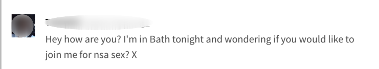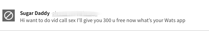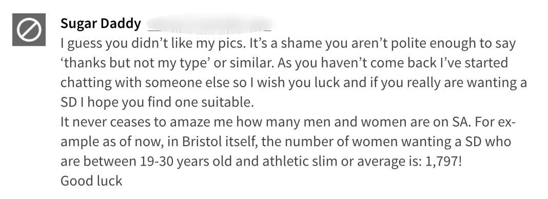 Even over SeekingArrangement’s messaging service Epigram’s reporters found that potential Sugar Daddies were impatient and put pressure on them to reply instantly. Some messages were expectant of Sugar Babies to provide a service, rather than form a mutually beneficial relationship, with one reporter being told ‘I’d expect you to travel to me...I believe the first meet should be about you showing me what you have to offer’.