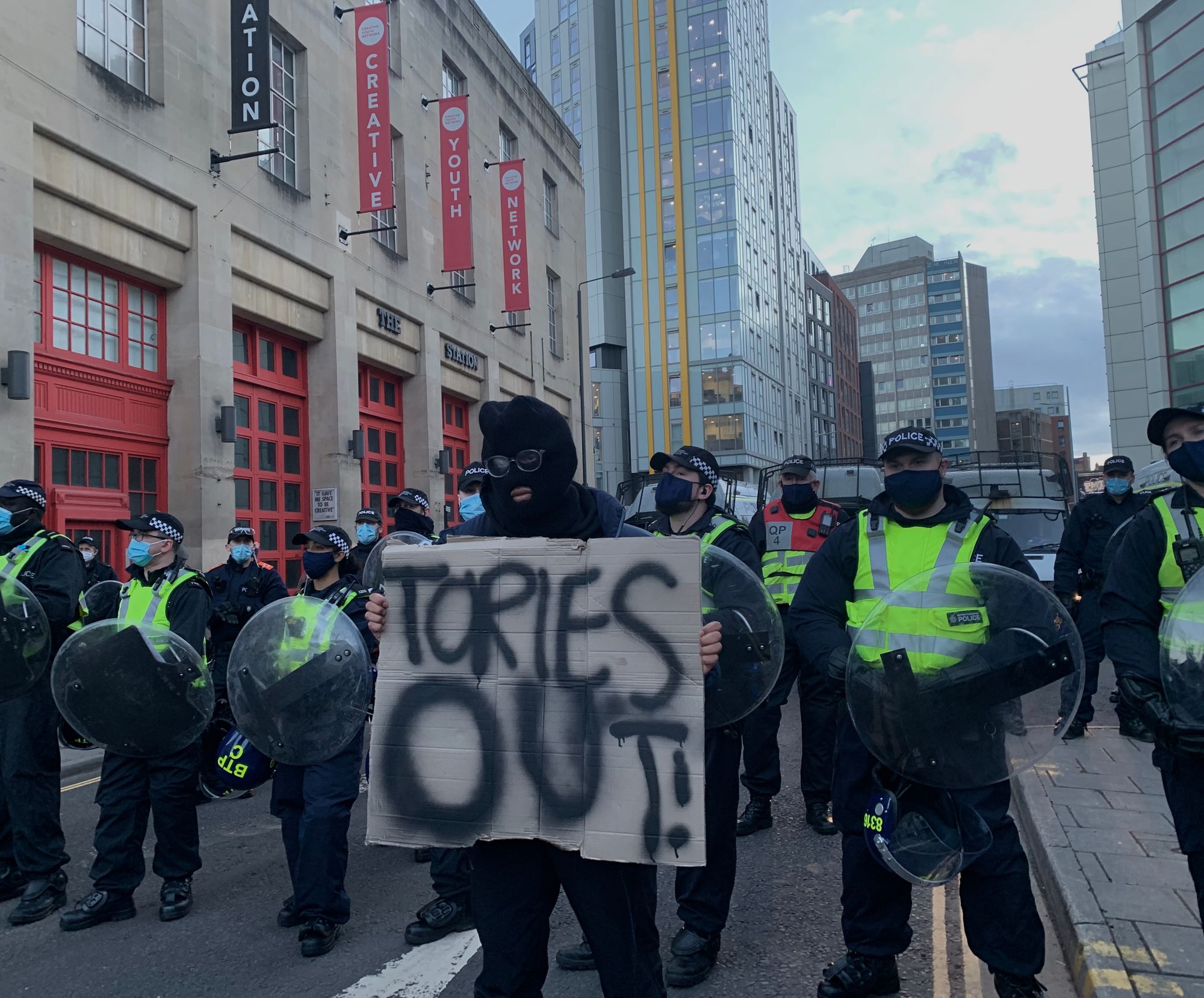 The demonstration against the Police, Crime, Sentencing and Courts Bill began earlier in the day on College Green, but moved to the city centre where large numbers of riot police dispersed, sometimes violently, what had been a largely peaceful crowd.