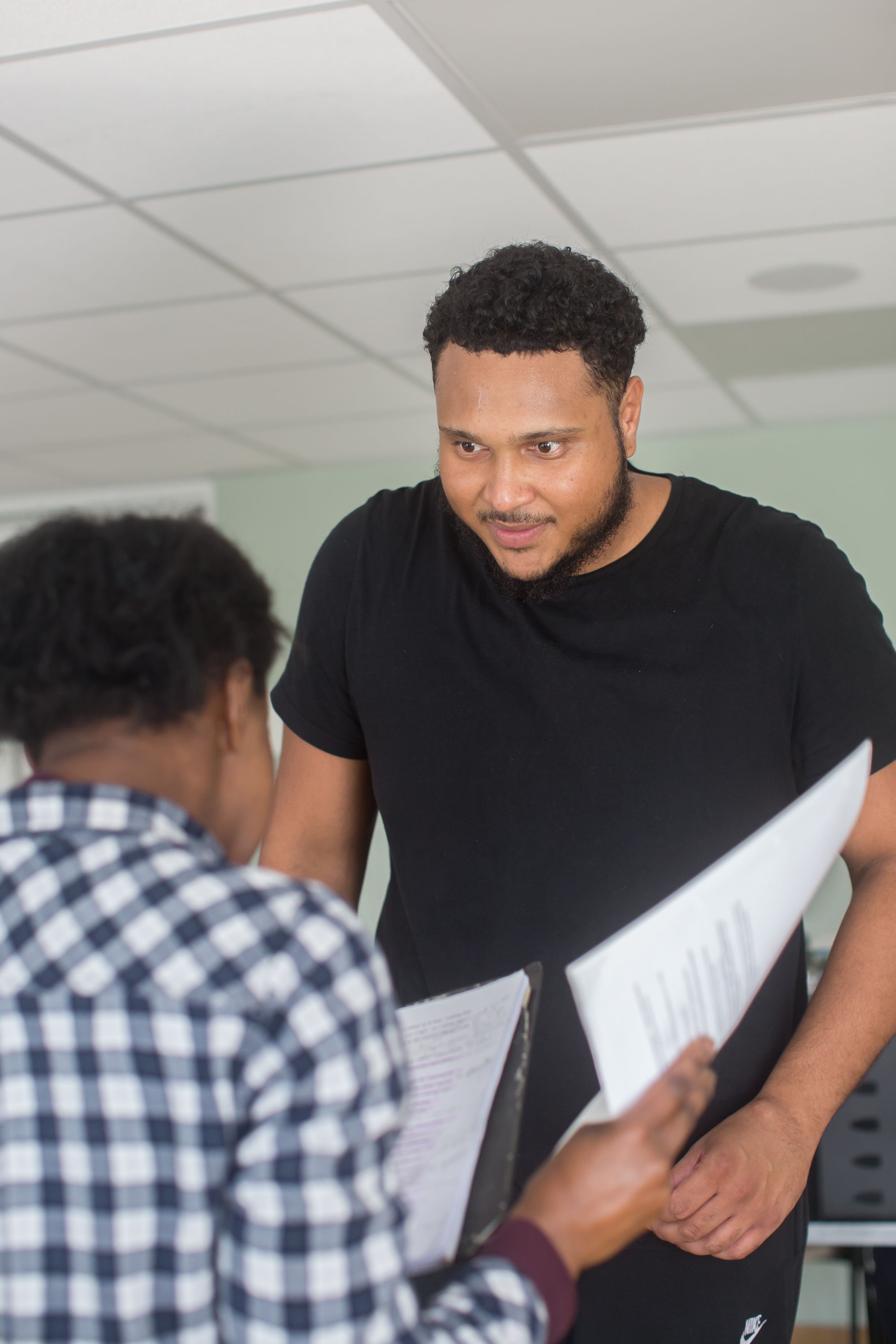 We see Ricky continually go to the desk in the centre of the stage, which serves as the Board of Education, The Job Centre, and the local council’s offices. They all offer him the same thing, waiting lists, platitudes, and leaflets. The problem with all of these is that Ricky cannot read.