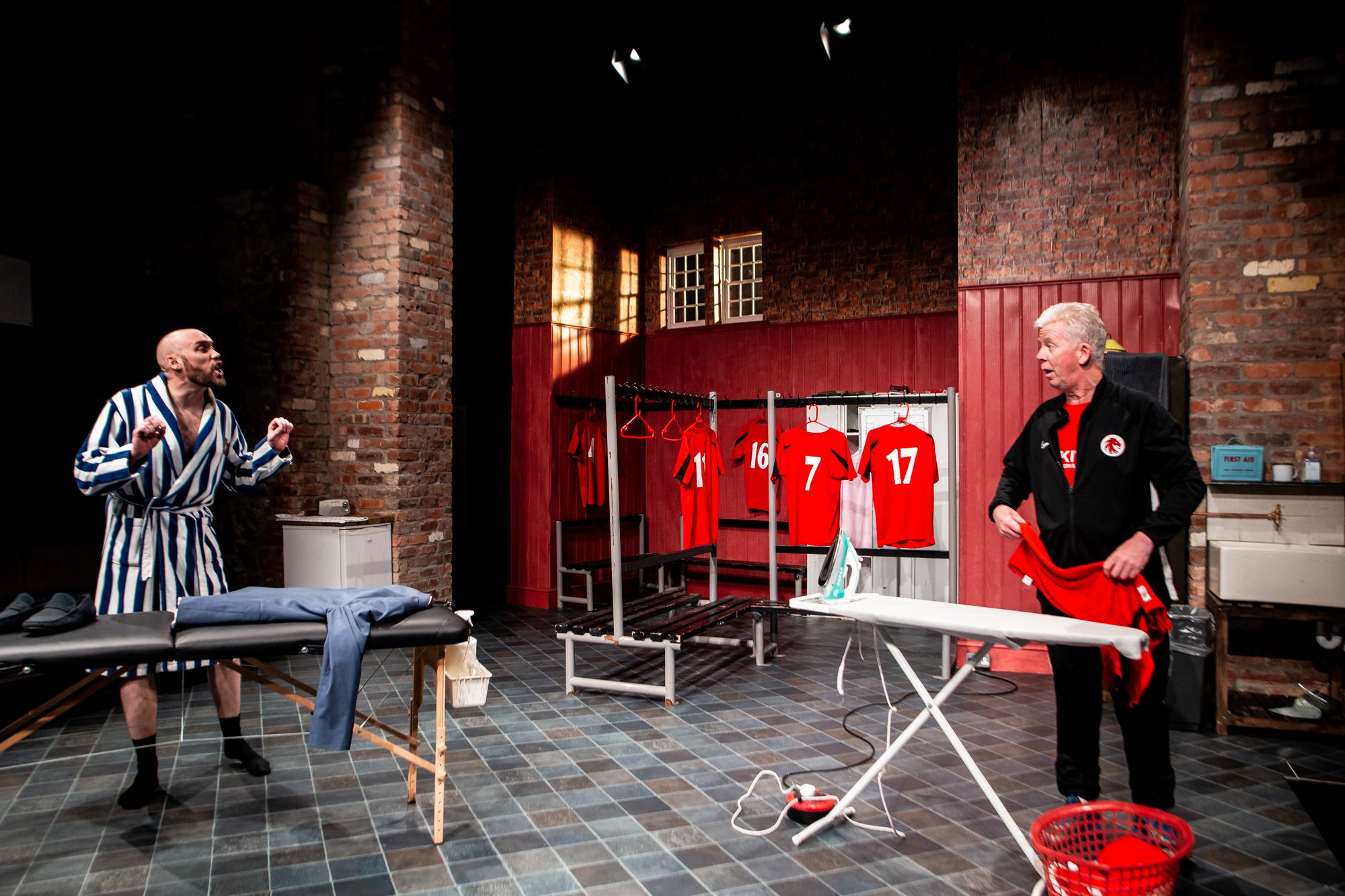 Performed in the Old Vic’s Weston studio, the space feels very intimate. Moreover, the play is set in a changing room where there is a great deal of undressing, which if anything makes the piece even more intimate. James Helps’ set is functional and unpretentious, and the addition of the advertisements around the audience adds to the ‘football’ aesthetic.
