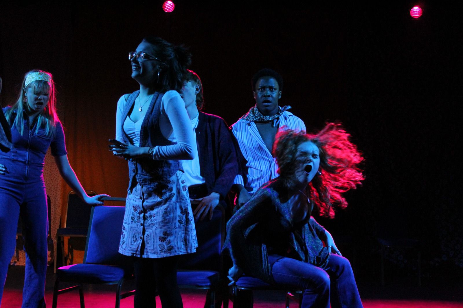 The highly charismatic and enthusiastic ensemble seamlessly transported us from the crowded dance floors of 1970s London to teenage band gigs and the awkward encounters of first loves. There were equally tender and intimate moments of vulnerability within the performance, especially the beautifully rendered, bittersweet burgeoning romance of Anna (Leila Entwistle) and Tessa (Sophia Woolfenden). For any recent fans of ‘Daisy Jones and the Six’, the audience could very much appreciate the perfectly chosen costuming of the show, along with its integral soundtrack and at times intense live music renditions.
