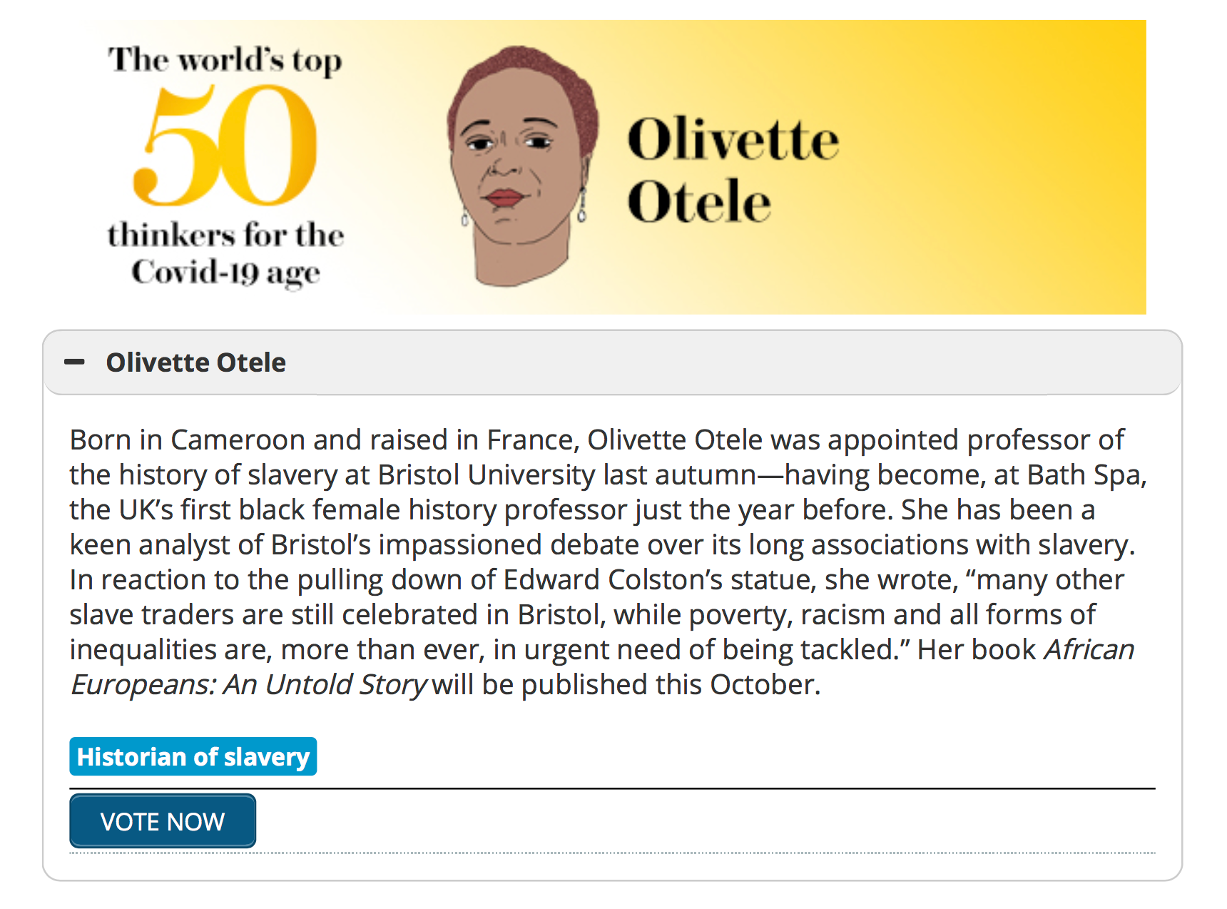 Fantastic to see our Professor of the History of Slavery @OlivetteOtele named as one of the world's top 50 thinkers for the COVID-19 age by @prospect_uk https://t.co/iMTSRfNGzF@UoBrisHistory @BrisBlackHums