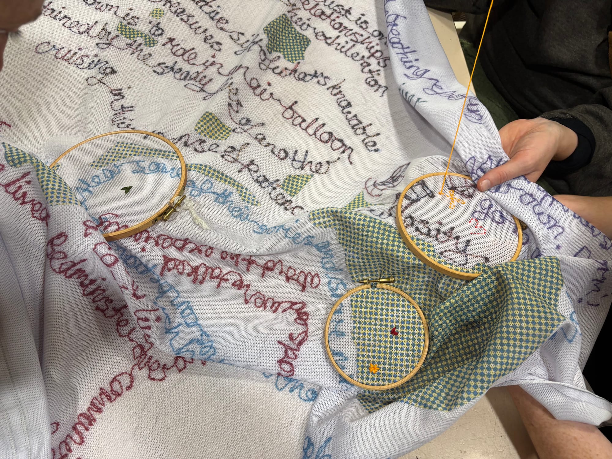 Her poems are interwoven into the material – a coarse fabric she sourced from scaffolders and building sites – in different coloured threads overlaid on a map of Bedminster. Five chairs are also threaded into the fabric, representing the participants and paying homage to the conversations and memories shared in them. At the showcase, people were invited to stitch places of personal significance into the banner, and the piece will subsequently be displayed at Windmill Hill City Farm for visitors to reflect upon.