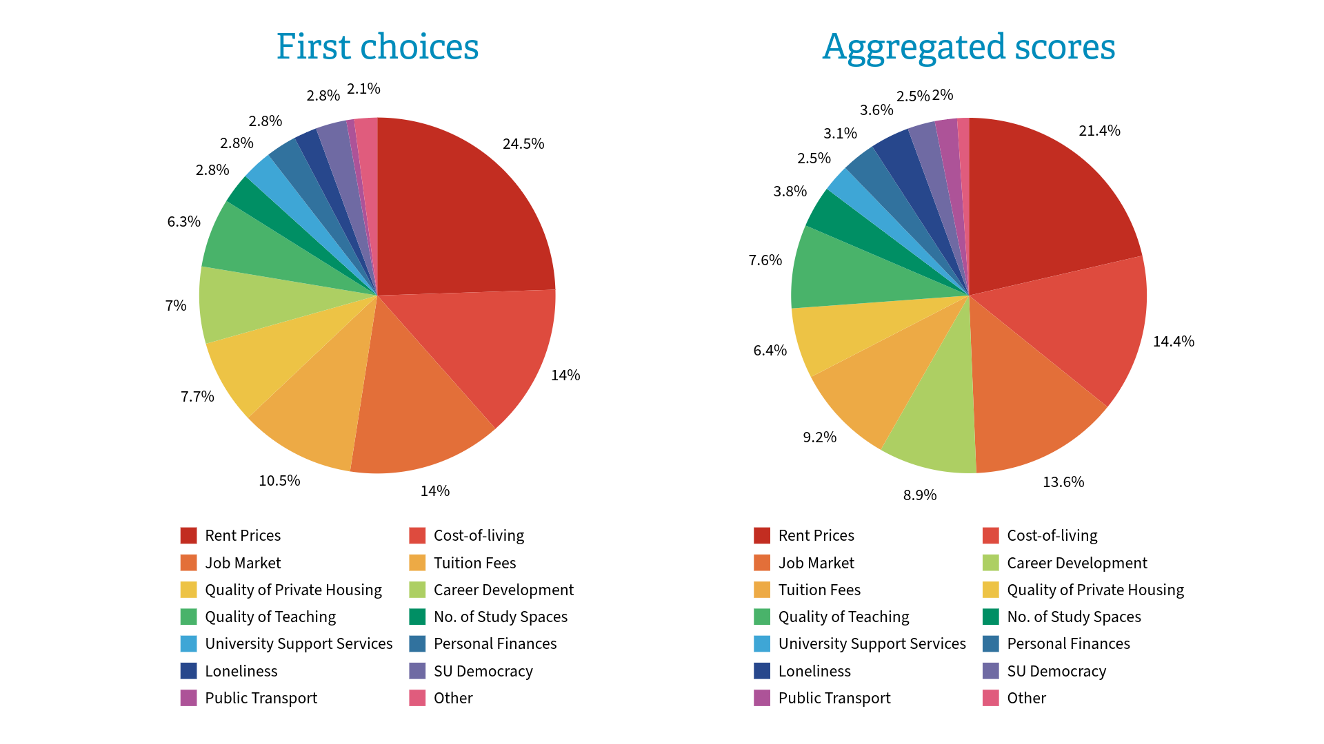 In Epigram’s survey, students were asked to rank their three biggest concerns or issues. This means we can represent this data in two ways: by first choice and a weighted score. By giving three points to people’s first choice, two to second, and one to third, we can see what issues are on people’s minds but not right at the front.