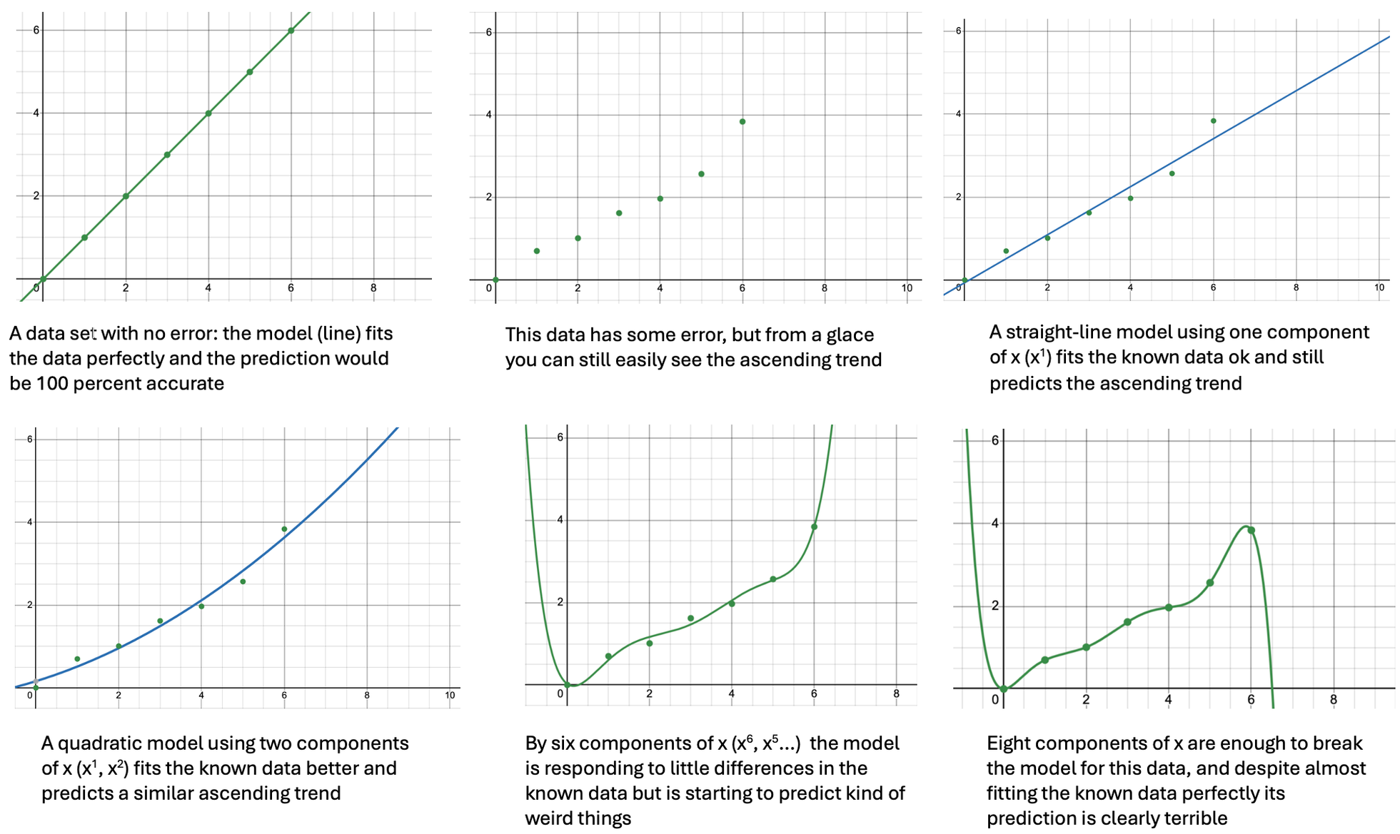 You can see the more factors of x (x1, x2, x3...) are included the better the model fits the known data, but the extrapolated prediction starts to vary wildly.